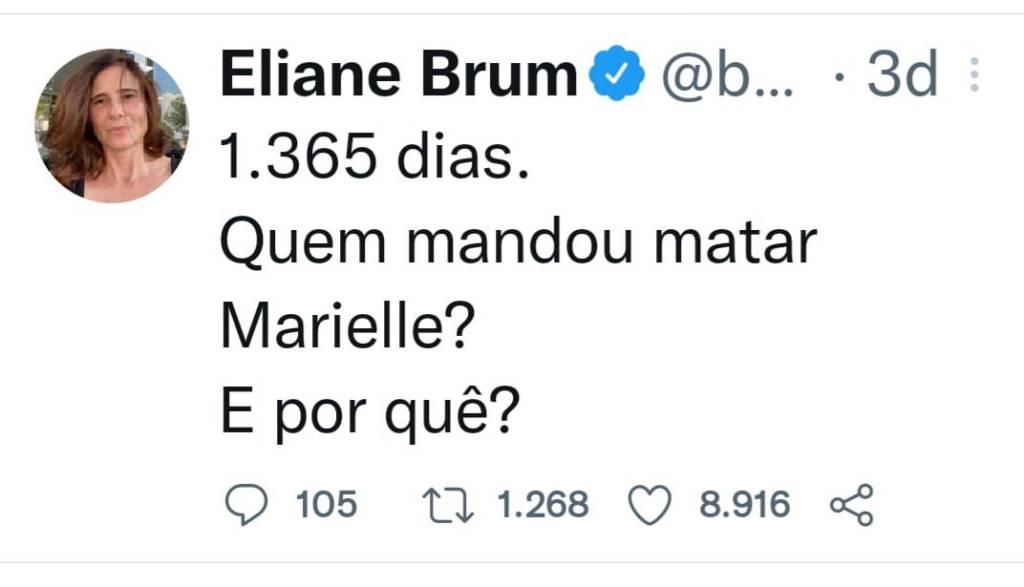 Um outro caso emblemático foi a violenta morte da ilustre Vereadora carioca, Marielle Franco. As investigações levaram para a prisão os culpados, mas a família e a esfera pública, enfim toda a sociedade, ainda espera pela resposta: Quem mandou matar Marielle? Pergunta que tem sido ecoada na memória jornalística global, como a jornalista brasileira, Eliane Brum, colunista do Jornal El País, em seu Twitter, que reiteradamente twita a pergunta supra citada. Enquanto não se descobre o mandante, humanamente, podemos elencar os assassinos mentais, tais como: o cancelamento, a gordofobia, misoginia, o feminicídio, a inveja, a xenofobia, o racismo e a intolerância de qualquer tipo. Todas essas mazelas sociais, são inimigos comuns, da humanidade e do amor ao próximo, além de serem más práticas mentais que levam quem as pratica à ruína moral, mental e física.