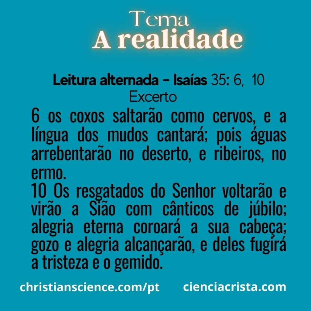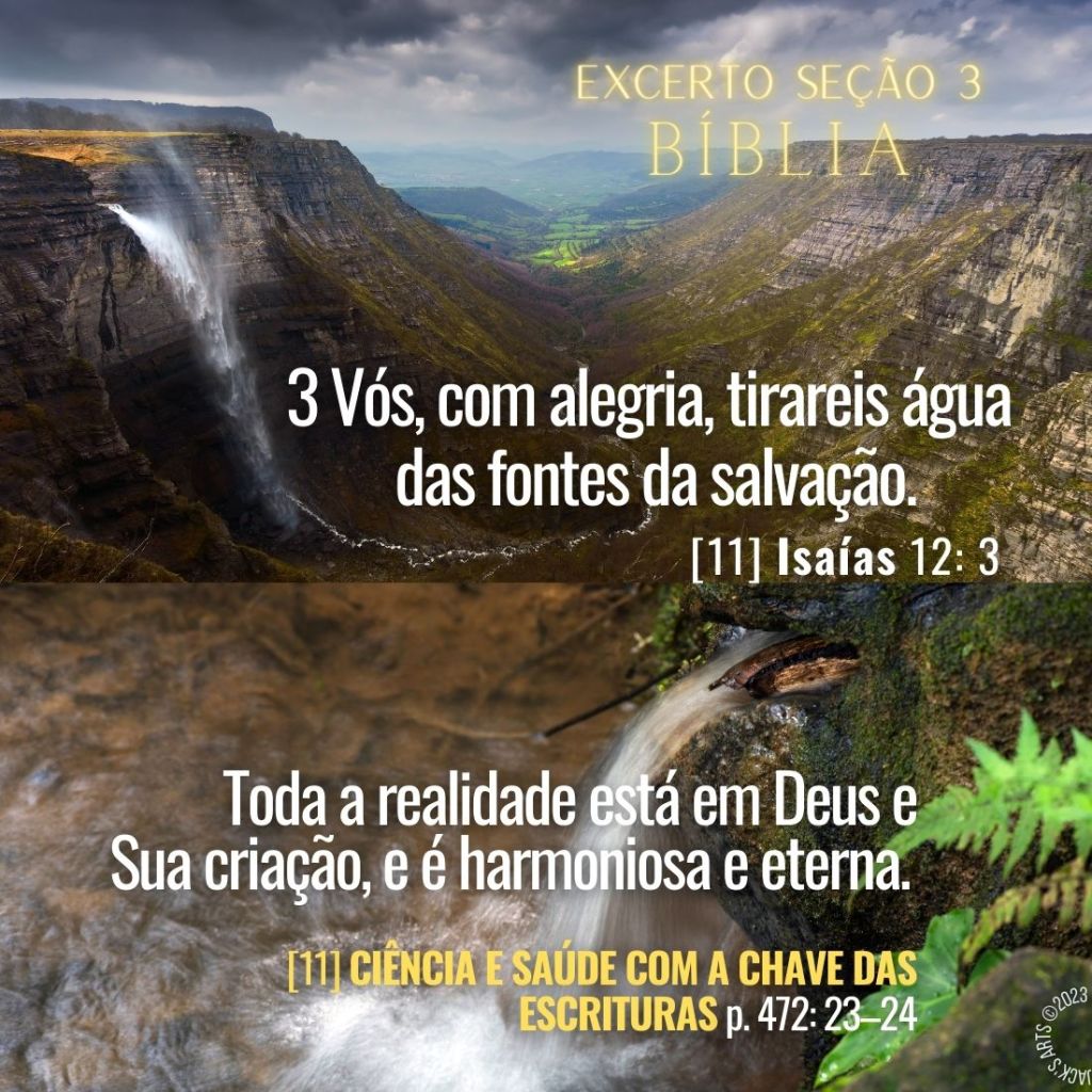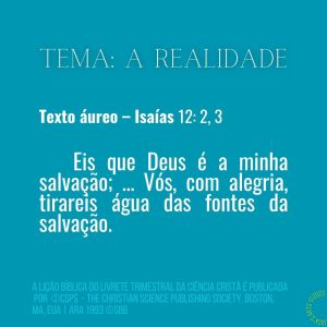 A consciência da realidade, divina e espiritual, é fonte inesgotável de salvação! Dando sequencia a duas imagens mentais trazidas na lição “A matéria”, é interessante notar a diferença que o Bible Lens — Lente da Bíblia — uma seção do Sentinel, trouxe entre uma “cisterna” e um “manancial que jamais seca”. No caso das cisternas há limite comum aos poços. que poderíamos associar ao limite da irrealidade material. Já a ideia de uma fonte como manancial “cujas águas jamais faltam”, é ampliada no tema desta semana, como a consciência da realidade. Quantas vezes a consciência da realidade, foi essencial para trocar a ideia de limitação do suprimento, pela realidade da abundância que vem da única fonte inesgotável, o Espírito? Em minha experiência pude demonstrar várias vezes, diante de experiências de demonstrar suprimento divino, para além do quadro material de crise, limitação, e até desalento!
