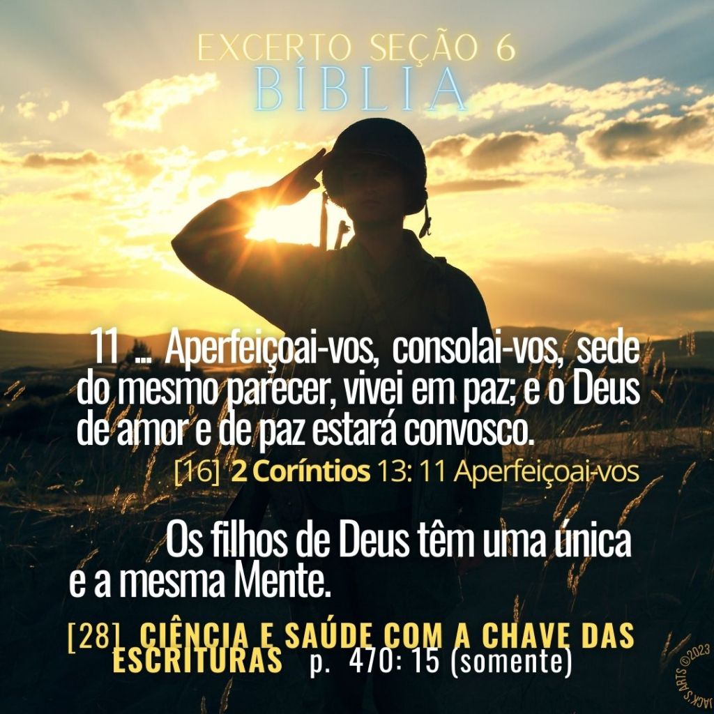 Com regozijo e gratidão à Mente divina, ela própria, que inspira todas as atividades da igreja, dos seus Dignitários, Praticistas, Enfermeiros, Professores, Capelães, Conferencistas, todos os Staffs de todos os departamentos, notem que em mais de uma Seção aparecem para realçar os atributos desta Mente divina: onipotente, onisciente, onipresente, incluiria outro: que inclui omnivisão — pois a Mente, a única inteligência e saber consciente, tudo vê! Enfim, recebamos o melhor que pudermos, com humildade, para orarmos juntos, frente aos desafios que assolam a humanidade — os erros da mente mortal que se repetem ao longo dos séculos e milênios, para que possamos ter nova oportunidade de compreender e demonstrar, que diante da supremacia e autoridade da Mente única, que é Tudo-em-tudo, tudo é sua manifestação, você, eu, a Igreja, enfim, toda a humanidade. Hoje agora e para sempre! A mente mortal que também é bem explicada na lição, gosto de pensar que ela é como um microscópico grão de pó, um ínfimo átomo de molécula mental, tragado no seu próprio “buraco negro” de seu caos, isto é, tal qual um grão de pó inerte, jogado e tragado na imensidão do infinito Cosmos da Mente divina! Amém!
