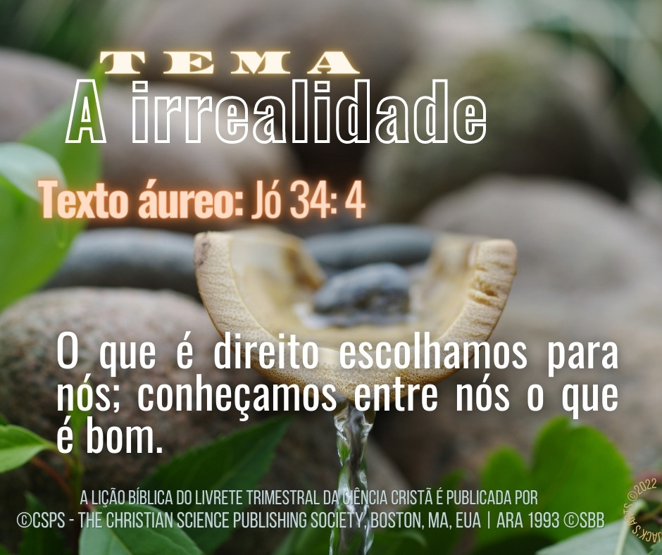 Para acessar facilidades colaborativas ao estudo individual da Lição Bíblica, no tema: “A IRREALIDADE“, dentre elas uma pesquisa de artigo dO Arauto, pertinente ao tema semanal, realizada por esse praticista, pertinentes ao novo tema e seu desdobramentos, clique no botão, Oásis de espiritualidade:
