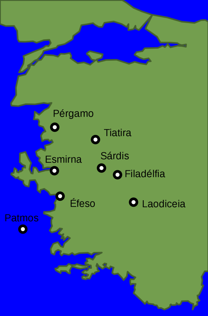 Dica para Escola Dominical: mostrar o mapa para os alunos das 7 cidades do Apocalipse. Na Escola Dominical que colaborei como professor havia uma coletânea de mapas, bem detalhados, dos tempos bíblicos, só não lembro ao certo se eles foram produzidos pela Sociedade Bíblica do Brasil. O resumido abaixo é da Wikipedia.