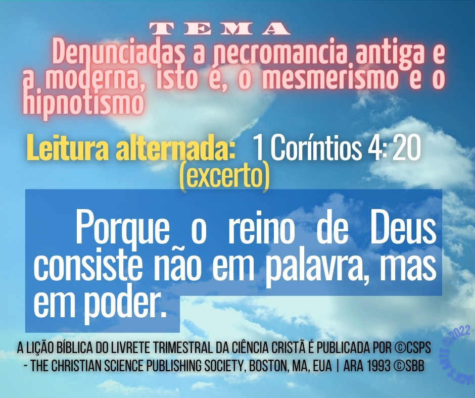 Tags: licao biblica, magnestismo animal, necromancia, mesmerismo, hipnotismo, teosofia, teodicéia, Ciência Cristã, Mary Baker Eddy, Livrete Trimestral, consciência elevada, mente mortal, progresso espiritual, espiritualidade, cientista cristão, Ciencia Cristiana, cura do paralítico, Leccion Bíblica, espiritualidad, O Arauto, El Heraldo, audio da licao, espanhol, português, Jackson Guterres, Praticista, Grupo Informal, Salvador, Bahia, Brasil