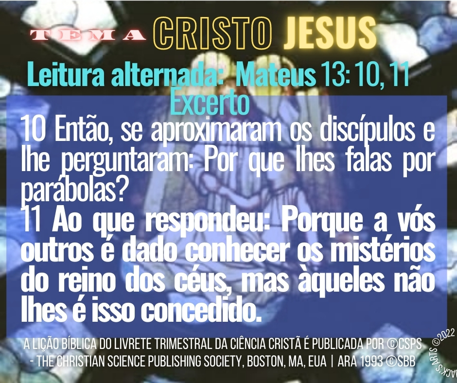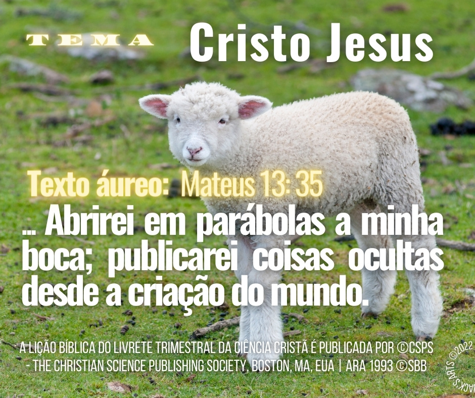 Bem-vindo ao estudo sobre o tema mais fundamental ao Cristianismo: “CRISTO JESUS“, A lição bíblica do Livrete Trimestral da Ciência Cristã, foi idealizada por Mary Baker Eddy, como um sistema de autoaprendizado constante essencial ao progresso espiritual, e, cabe mencionar, gratamente, que é um presente de espiritualidade dA Igreja Mãe, para toda a humanidade, e, não só para os os Cientistas Cristãos, e nesta semana convida-nos a aprender com “nosso grande Professor” (Ciência e Saúde p. 33) e único exemplo — modelo — da Ciência do Cristianismo.