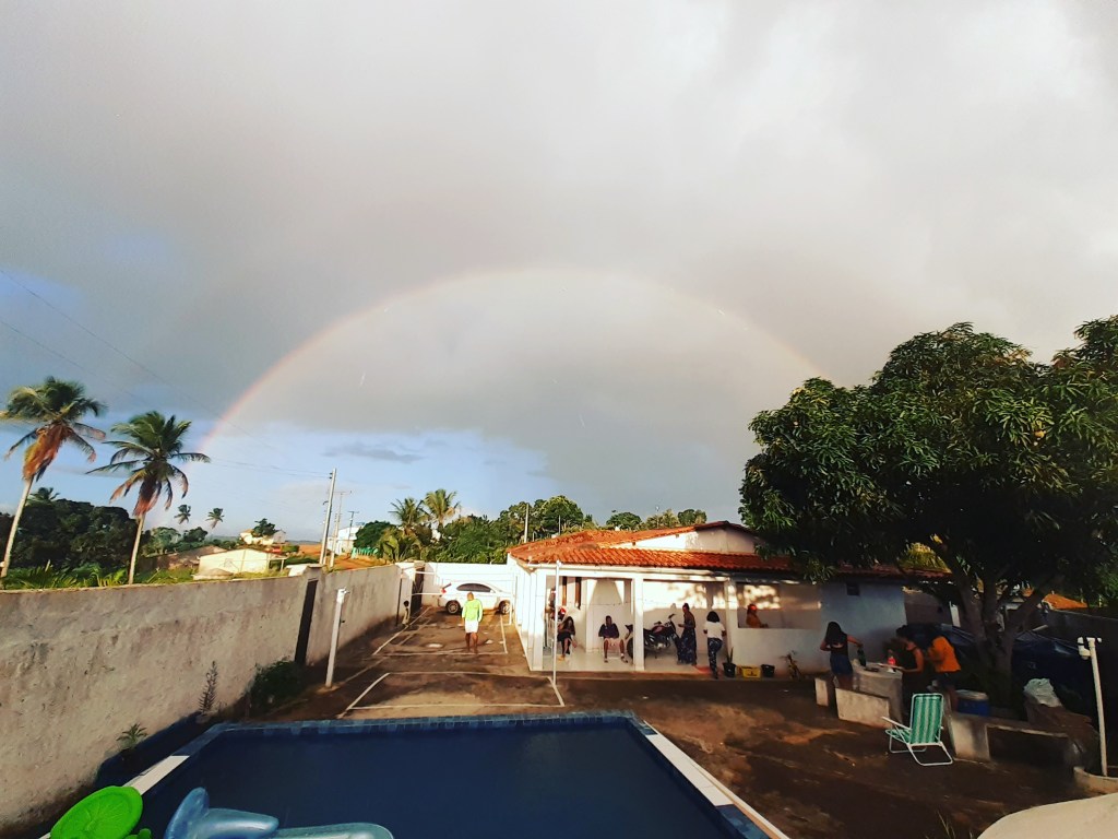 Esse fim de semana, visitando meus Sogros, em Riachão do Dantas, em Sergipe, tive oportunidade de contemplar um duplo arco-íris, embora os dois não tenham ficado visíveis na tentativa de captura acima. Embora seja um fenômeno ótico raro, no céu, o arco-íris é a refração da luz nas gotas de chuva! Também pode ser observado quando um raio de sol, com sua luz branca, atravessa um cristal. Embora aparentemente invisível na luz branca, ao aparecer o espectro de cores projetado noutra das extremidade do cristal, pode-se contemplar a beleza das diferentes cores, as quais juntas fazem surgir a luz branca!